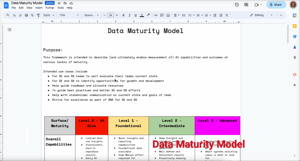 Are you wondering how mature your data team is in terms of AI? Our Data Maturity Model Template can help you determine just that! This model evaluates your team's AI maturity level at each stage, from Level 0 to Level 3.